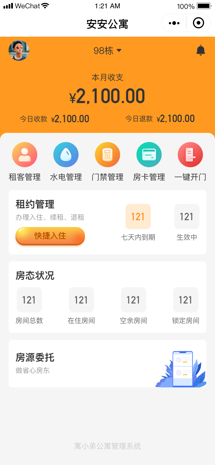 你們公司的那個公寓管理系統(tǒng)好強大啊,安裝了智能鎖后,我現(xiàn)在用微信就能觀察幾十個房間入駐情況,還能催租,又不用上門跑,真爽!